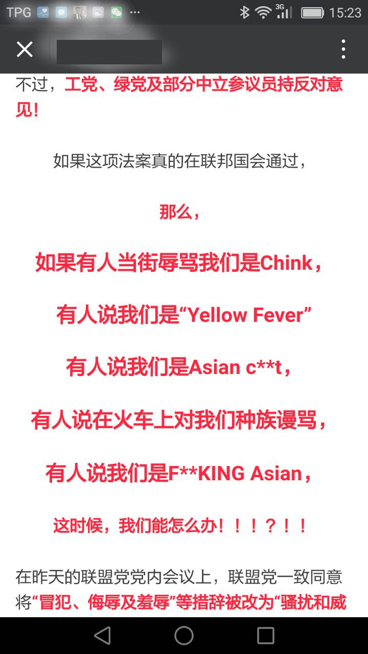 助理财长答复(参考5):基于他们的种族公开诋毁某人是违法的。将18C的术语改变为包括“骚扰”在内的做法,将加强我们的种族歧视法。 此外,针对这种(非法的)行为我们还有国家刑法和民法的保护“ (作者按:脱离上下文将这种辱骂华人的场景单列(参考4)出来挑事,这种言论除了忽悠华人起来对抗外,我不知道对华人地位的提升有多大的帮助?)